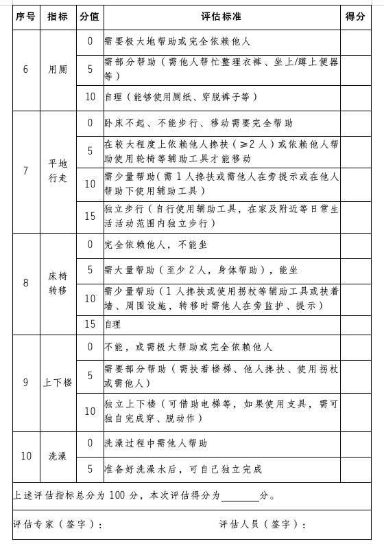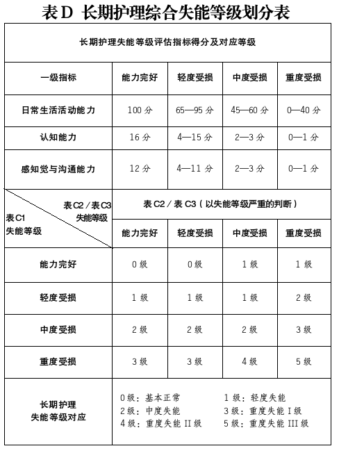 表D 長期護理綜合失能等級劃分表