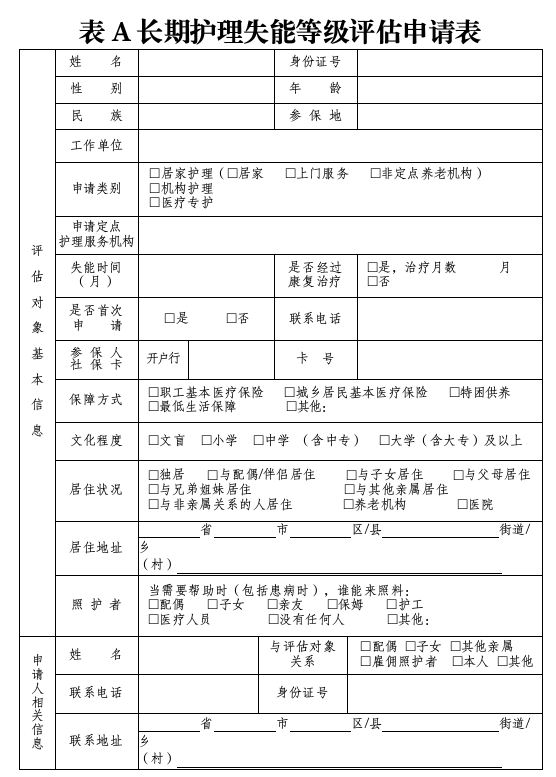表A 長期護理失能等級評估申請表