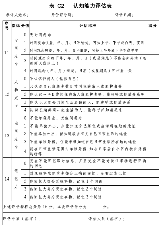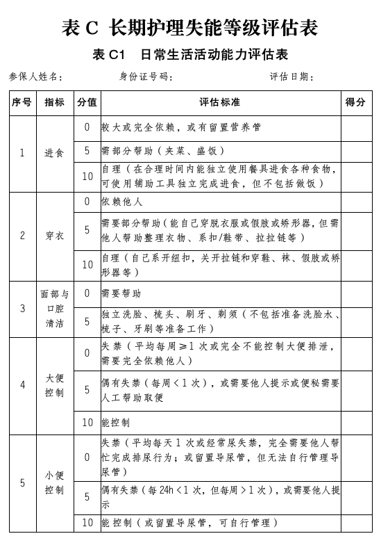 表C 長期護理失能等級評估表
