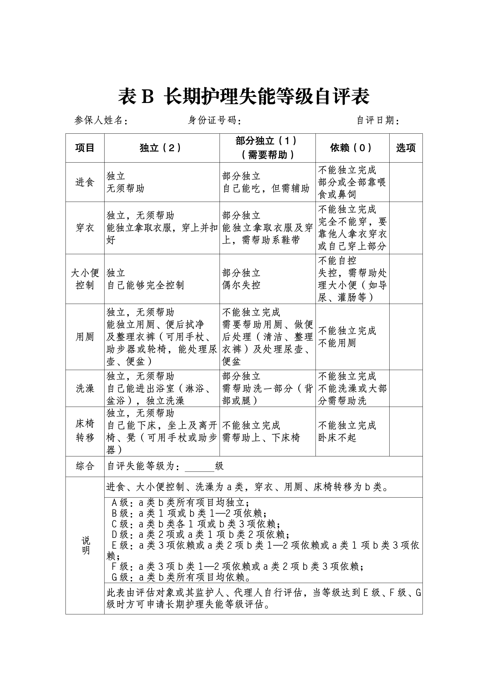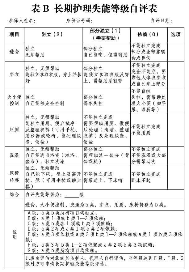 表B 長期護理失能等級自評表