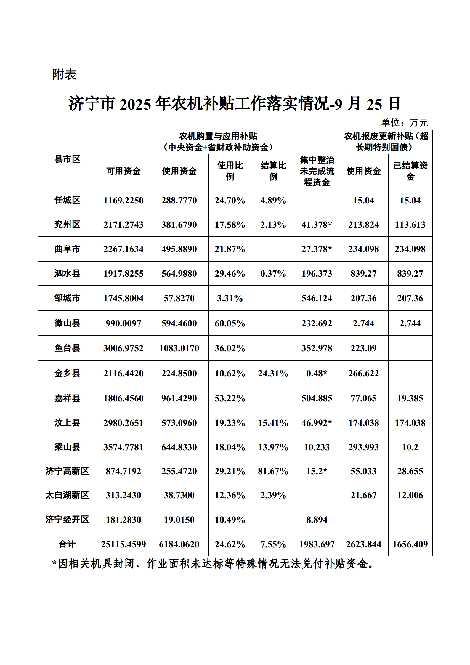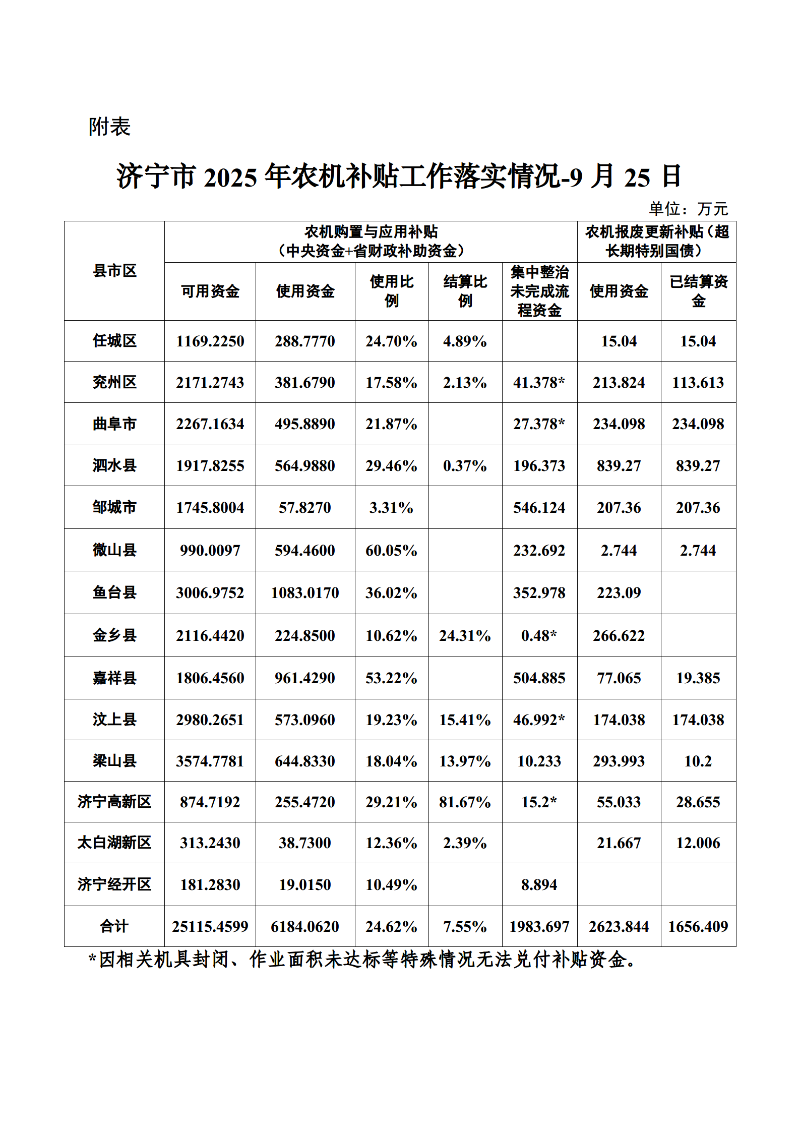 附表:濟寧市2025年農機補貼工作落實情況-9月25日